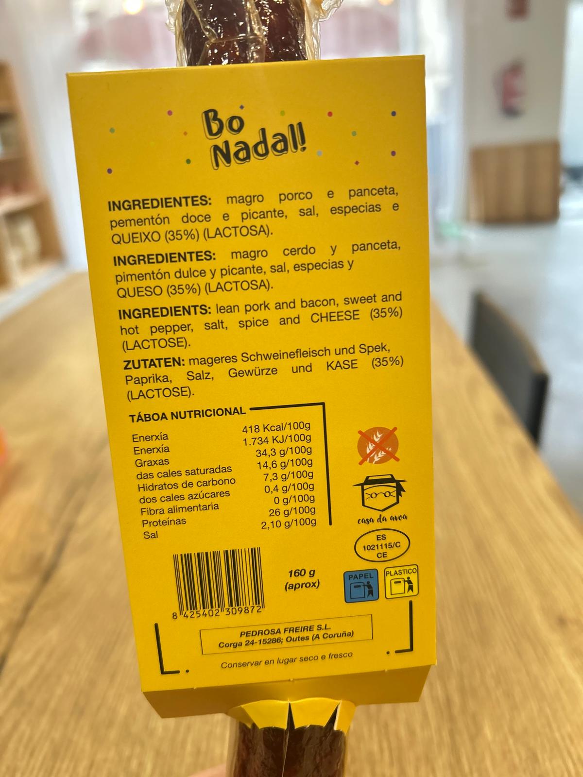 INGREDIENTES: Magro de cerdo y panceta, pimentón dulce y picante, sal, especias y queso (35%).