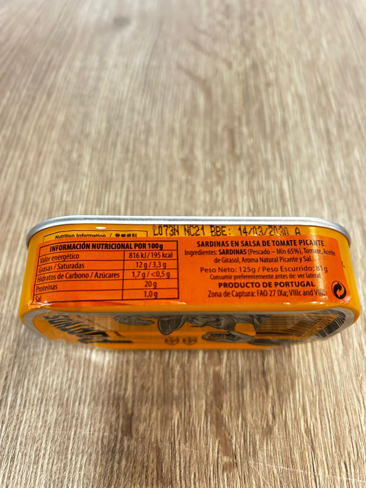 Ingredientes: Sardinas (Pescado 65%). Tomate aceite de girasol, Aroma Natural picante y sal.