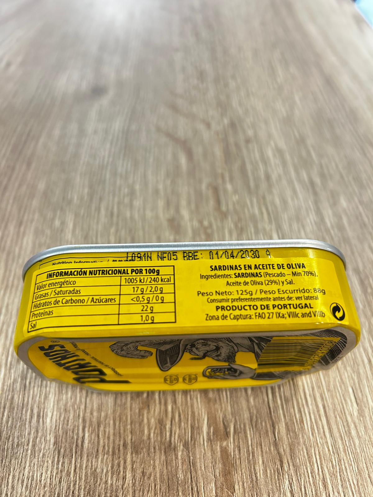 Ingredientes: SARDINAS ( Pescado- Min 70%), Aceite de oliva y sal.