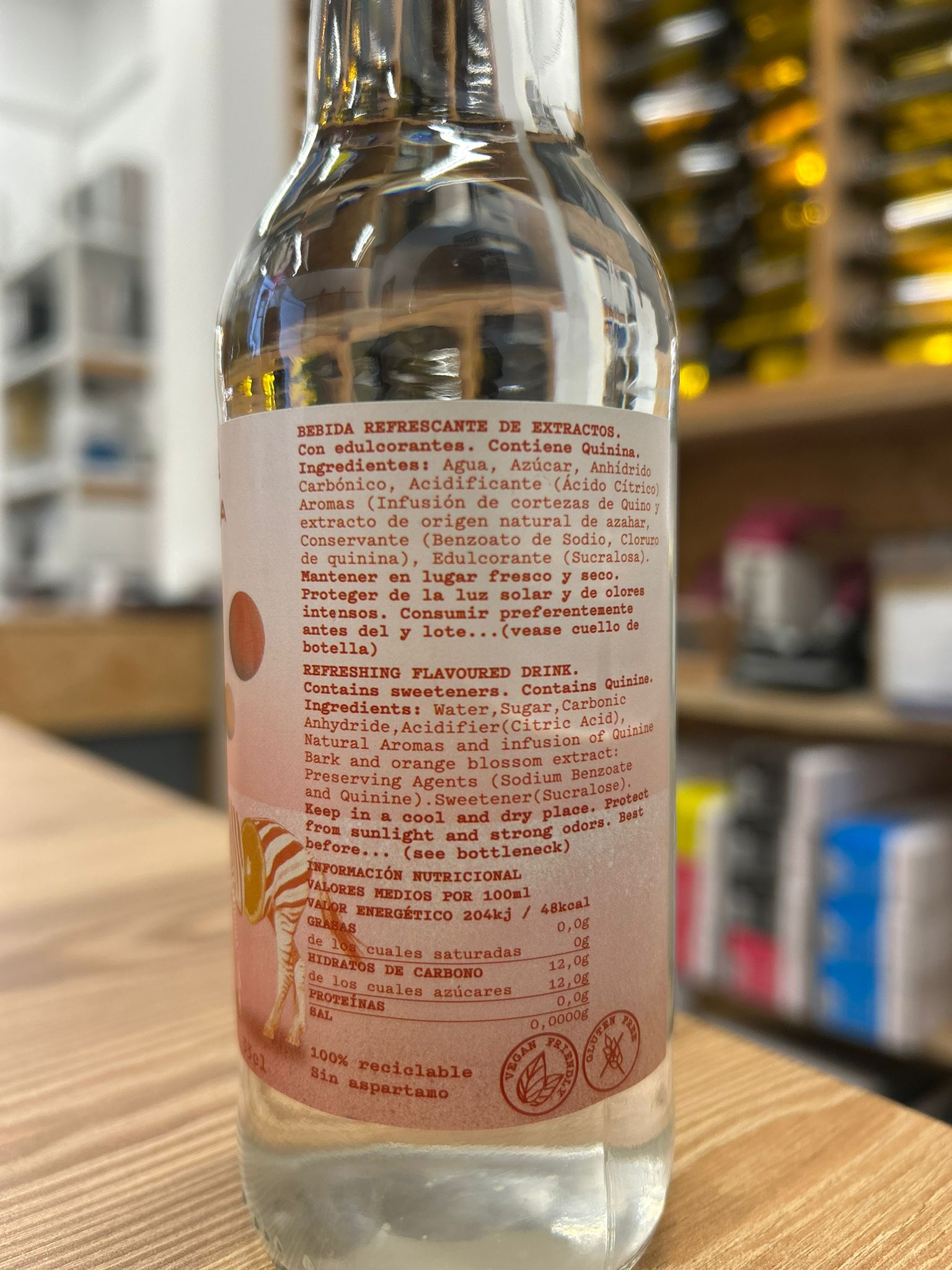 Ingredientes: Agua, azúcar, anhidrido carbónico, acidificante, aromas( infusión de cortezas de quino y extracto de origen natural de azahar) conservantes, edulcorantes.