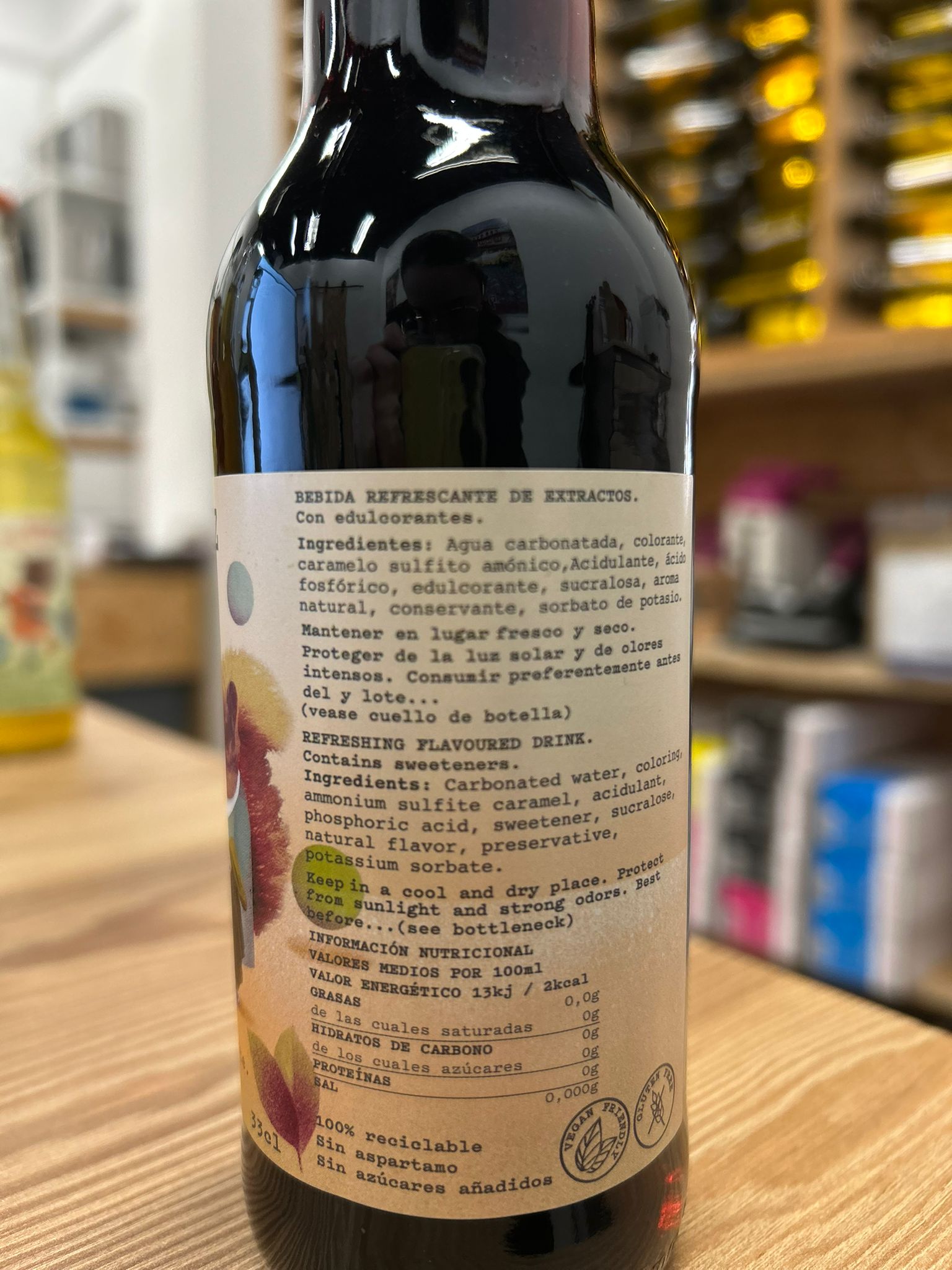 Ingredientes: Agua carbonatada, colorante, caramelo sulfito amónico, acidulante, ácido fosfórico, edulcorante, sucralosa, aroma natural, conservante , sorbato de potásico.