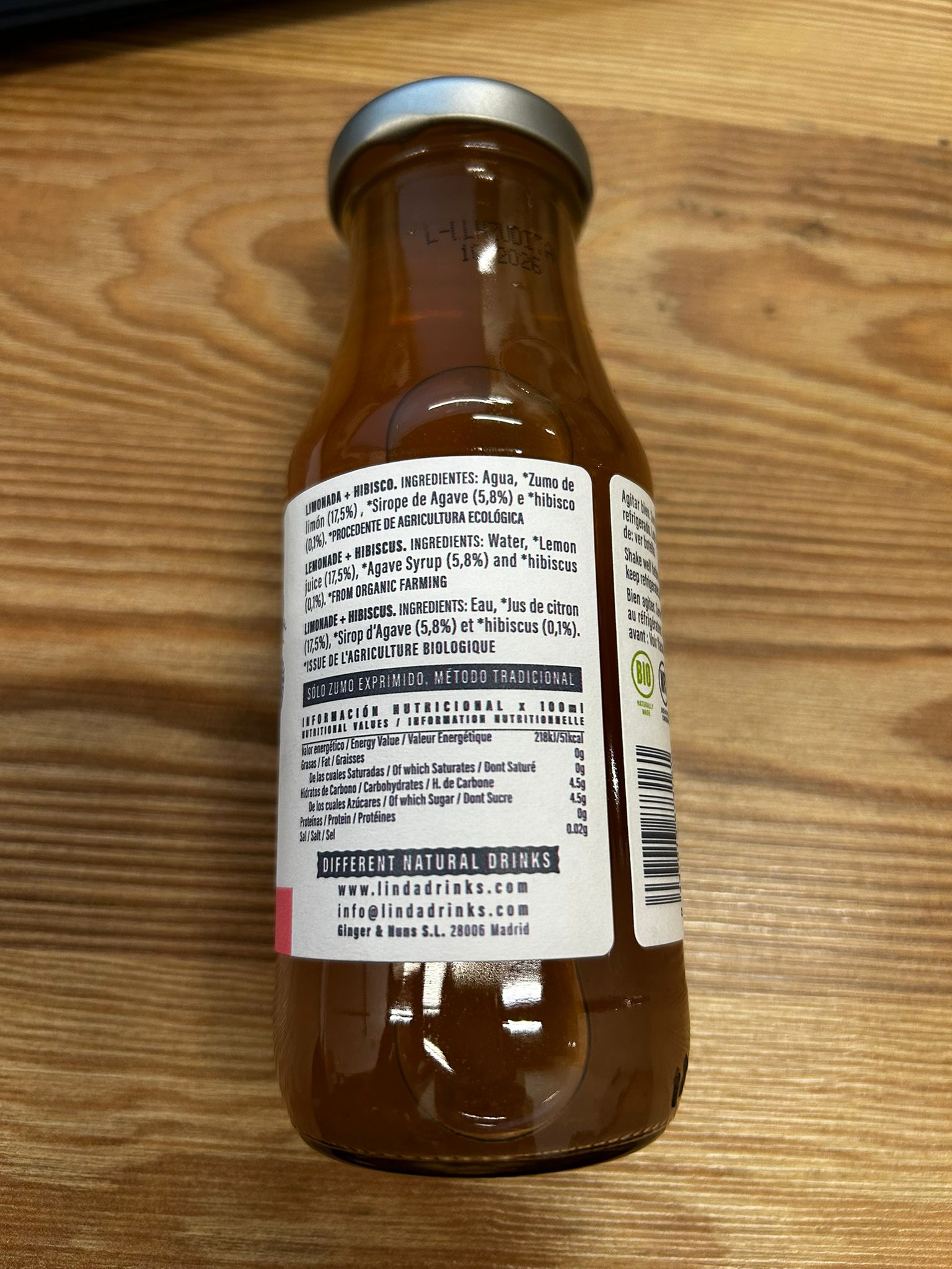 Ingredientes: Agua, zumo de limón, sirope de agave e hibisco